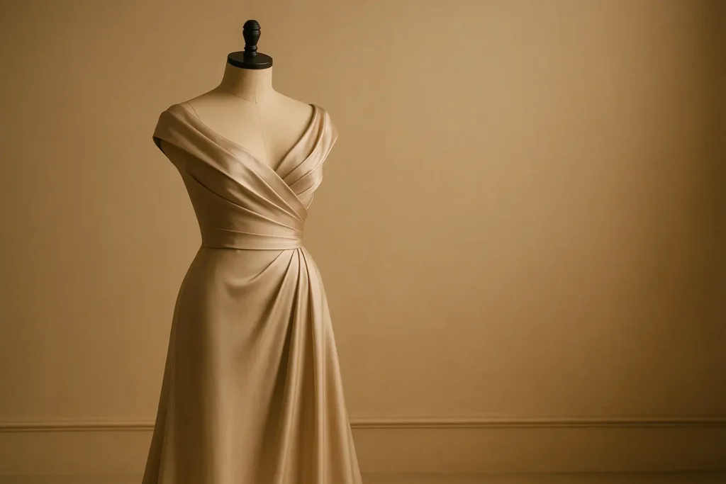 Un vestido de alta costura confeccionado en seda premium, con caída suave y detalles artesanales. Diseñado para realzar la elegancia natural con un estilo luminoso, delicado y atemporal en cada movimiento.
